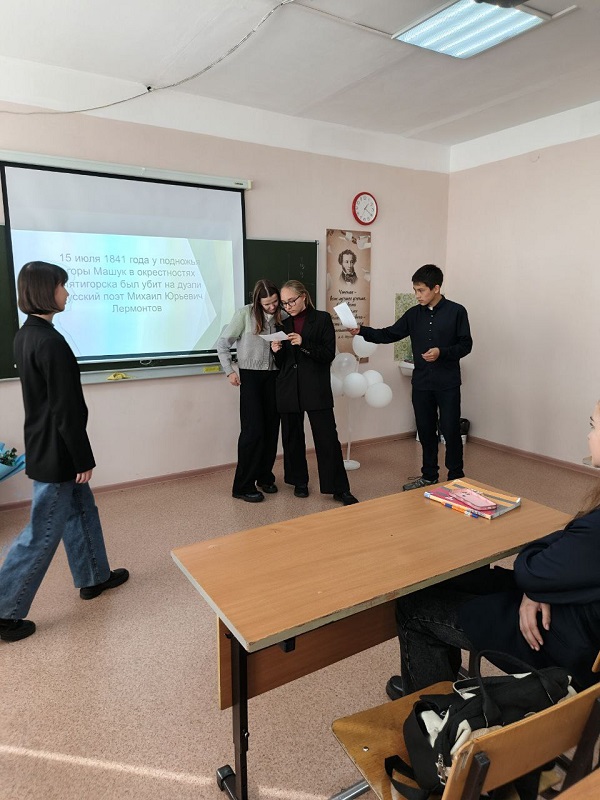 Целью мероприятия стало не только знакомство школьников с жизнью и творчеством Лермонтова, но и создание многогранного образа поэта, раскрытие его личности через призму художественного мира. В ходе беседы были затронуты темы детства Лермонтова, его взросления, становления как выдающегося поэта, драматурга и художника, а также влияние этих периодов на его творчество.